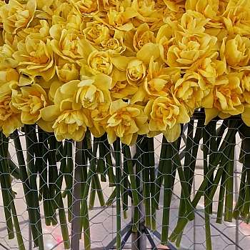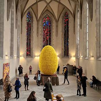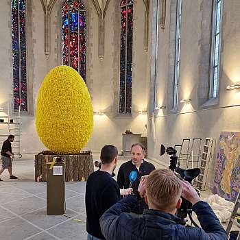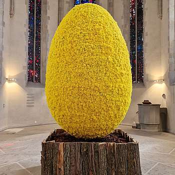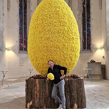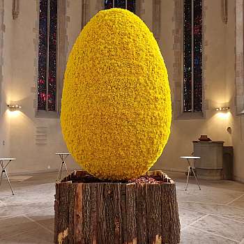 Mit einer Höhe von 3,5 Metern, einem Durchmesser von 2,2 Metern und einem Umfang von 6,9 Metern, präsentierte Paul Fleischli, ein über­dimensionales Osterei aus 30'000 gelben Osterglocken.
